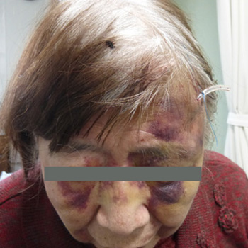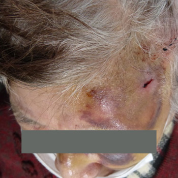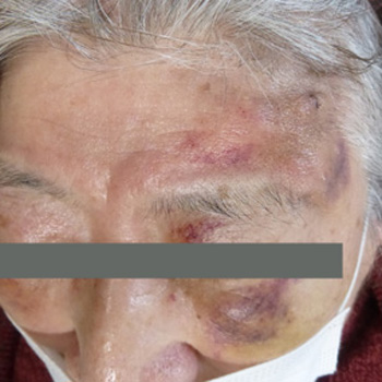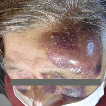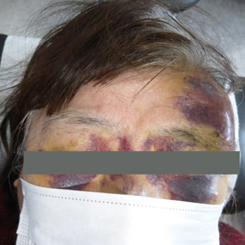 左側のおでこ、顔面を強打。皮下血腫、表皮の挫創あり。